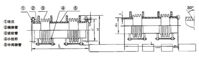 JXH型小拉桿橫向波紋補償器,由兩段波紋管,中間接管及帶有限位螺母的小拉桿等零件組成。小拉桿不能承受內(nèi)壓推理。JXH型小拉桿橫向波紋補償器可以補償彎曲管段的橫向位移和角項位移,同時可以補償軸向位移。JXH型小拉桿橫向波紋補償器安裝完后,務必將小拉桿上的落幕松開并離開耳片一段距離。