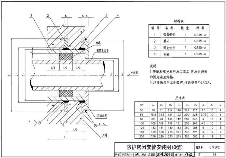C型;鋼制套管 數(shù)量1材質(zhì)(Q235A)翼環(huán)數(shù)量1 材質(zhì)(Q235A) 固定法蘭 數(shù)量1 材質(zhì)(Q235A 擋板數(shù)量1 材質(zhì)(Q235A)說明;管道和填充材料施工完后,再施行擋板和固定法蘭焊接。