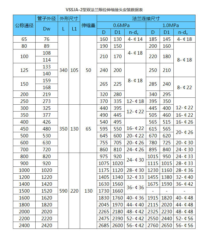 雙法蘭限位伸縮接頭應用范圍VSSJA-2型雙法蘭限位伸縮接頭適用于輸送海水、淡水、冷熱水、飲用水、生活污水、原油、燃油、潤滑油、成品油、空氣、煤氣、溫度不高于250度的蒸汽和顆粒粉狀等介質。雙法蘭限位伸縮接頭功…