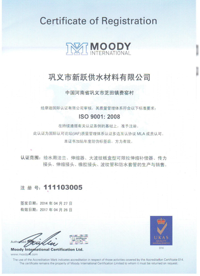 歡迎來到鞏義市新躍供水材料有限公司官方網(wǎng)站!您現(xiàn)在訪問的是:《ISO9001中文認(rèn)證》頁面,如需幫助請致電:13140066578 或 0371-64100988