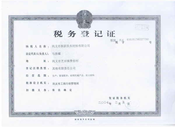 歡迎來到鞏義市新躍供水材料有限公司官方網(wǎng)站!您現(xiàn)在訪問的是:《稅務(wù)登記證》頁面,如需幫助請(qǐng)致電:13140066578 或 0371-64100988